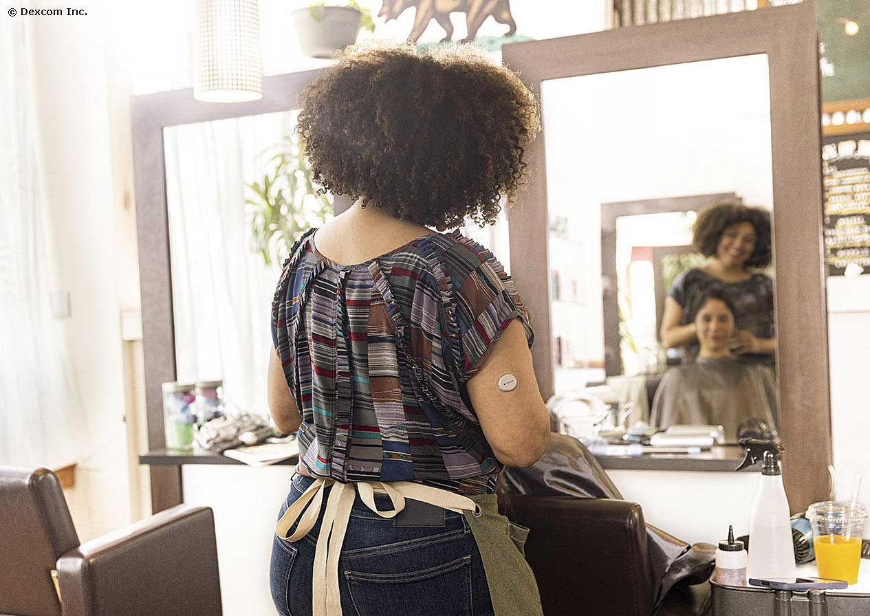 Bildunterschrift: Friseurin mit Dexcom G7-Sensor.