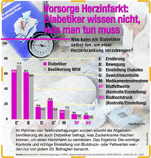 Weniger als ein Fünftel der Befragten wusste, dass bei Diabetes das Infarktrisiko genauso hoch ist wie beim Nichtdiabetiker nach einem durchlebten Herzinfarkt. Nur die Hälfte aller Studienteilnehmer konnte überhaupt typische Infarktsymptome (Angina pectoris, Luftnot, Enge in Brust, Schmerzen im Oberarm usw.) benennen. Der Gruppe von Diabetikern waren diese Anzeichen noch weniger bekannt. Das fehlende Bewusstsein selbst bei den wichtigsten Risikofaktoren wie Bluthochdruck, Diabetes und hohe Fettwerte sei erschreckend. "Wenngleich das Krankheitsbewusstsein bei Menschen mit Diabetes höher als in der Allgemeinbevölkerung ist, von den Betroffenen wurden entscheidende Parameter bei Faktoren, die man beeinflussen kann, zuletzt genannt", so Tschöpe.