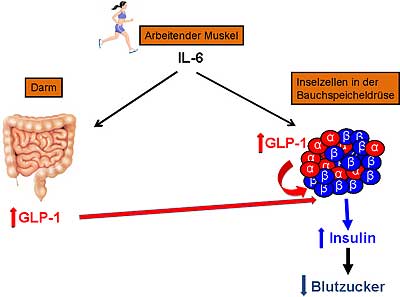 Der arbeitende Muskel produziert ein Molekül namens Interleukin-6 (IL-6), dessen Bedeutung bisher jedoch unklar war. Bekannt ist daneben, dass die L-Zellen im Darm ein Hormon produzieren, das sogenannte Glucagon-like-Peptid-1 (GLP-1). Dieses GLP-1 wird durch Mahlzeiten über den Darm stimuliert und regt die Insulinproduktion an.