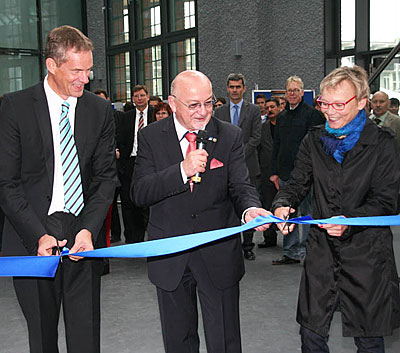 Bildunterschrift: Brandenburgs Wissenschaftsministerin Kunst, TH-Präsident Ungvári und TK-Gesundheitsmanager Holm (v.r.n.l.) eröffnen gemeinsam die TK-Lounge.