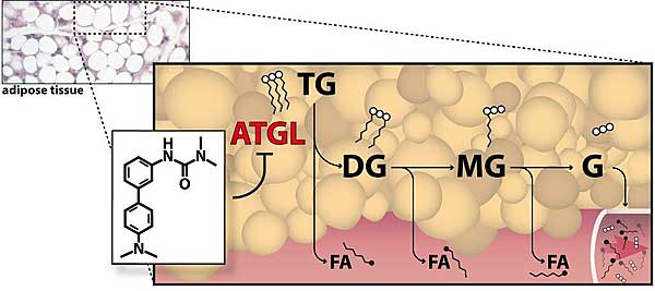 Originalpublikation: Mayer, N., Schweiger, M., Romauch, M., Grabner, G., Eichmann, T., Fuchs, E., Ivkovic, J., Heier, C., Mrak, I., Lass, A., Höfler, G., Fledelius, C., Zechner, R., Zimmermann, R. & Breinbauer, R.: Development of small-molecule inhibitors targeting adipose triglyceride lipase. Nature Chemical Biology, 2013. doi:10.1038/nchembio.1359