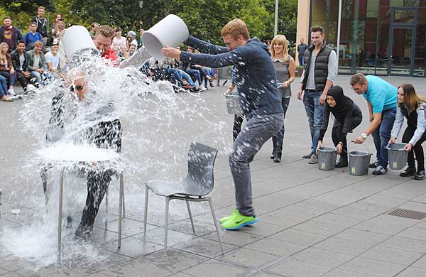 Virales Marketing im Selbsttest: Prof. Dr. Laurence Welford von der SRH Hochschule Heidelberg ließ sich von seiner Kollegin Maike Grotz und acht Studierenden mit Eiswasser übergießen, um auf die Nervenkrankheit Amyotrophe Lateralsklerose (ALS) aufmerksam zu machen. Als Marketing-Professor hatte Welford auch ein wissenschaftliches Interesse. Nach seiner Beteiligung an der Ice Bucket Challenge berücksichtigte er nicht nur die ALS Association mit einer Spende, sondern auch die Deutsche Diabetes-Stiftung. Deren Online-Spenden stiegen plötzlich um das 29-Fache."Die virale Natur dieser Kampagne ist atemberaubend und es wird sicher noch viele Marketing-Case-Studies dazu geben. Aber das Wichtigste ist, dass damit die Aufmerksamkeit auf wenig beachtete Themen gezogen wird. Und das auf eine witzige Art und Weise." Prof. Welford musste am 26. August neun Kübel Eiswasser aushalten - vermutlich ein Weltrekord. Dieser Einsatz hat 470 Euro Spenden eingebracht: von der Hochschule, von Studierenden, Mitarbeitern und Welford selbst.
