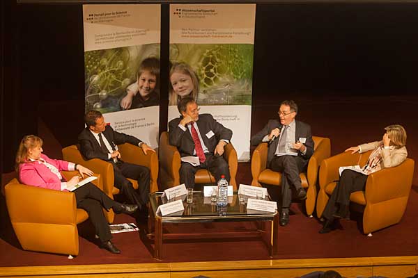 Bildunterschrift: Podiumsdiskussion (v.l.n.r. Florence Rivière-Bourhis, Riccardo Perfetti, Prof. Günther Wess, Christian Boitard, Isabelle Thizon-De-Gaulle)