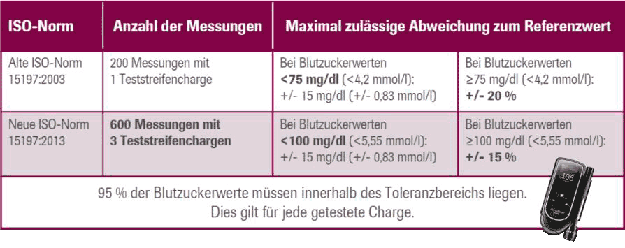 Die Zahl der verfügbaren Blutzuckermessgeräte ist in den vergangenen Jahren stark angestiegen. Wie eine Studie zeigte, erfüllen bei weitem nicht alle die Qualitätskriterien der Normen: während circa 80 % der getesteten Geräte die noch gültige, alte ISO-Norm von 2003 erreichen, konnte beinahe jedes zweite System den Standard der neuen ISO-Norm von 2013 nicht einhalten. Wer sicher gehen möchte, ob ein Gerät die Norm erfüllt, kann beim Hersteller anfragen, ob ein sogenannter Evaluierungsbericht nach den Kriterien der neuen ISO-Norm für sein Gerät vorliegt.