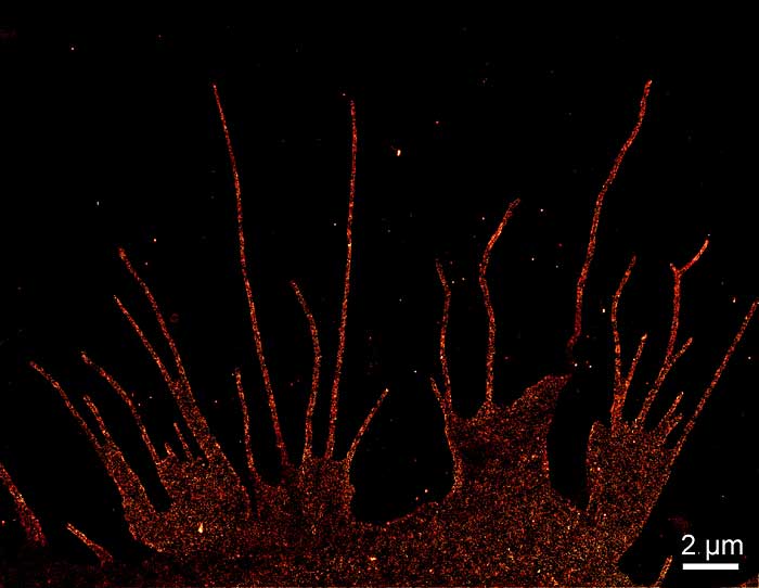 Bildunterschrift: Mikroskopietechnik dSTORM: Verteilung des beta-1-adrenergen Rezeptors auf der Membran einer Nierenzelle mit fast molekularer Auflösung. Die fädigen Strukturen sind Ausläufer der Zelle.