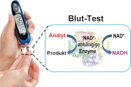 Bildunterschrift: Kombiniert man ein Blutzuckermessgerät mit NADH-Molekülen als Mediator an der Elektrode, so kann man mit einem Gerät sowohl den Blutzucker als auch den Laktat-Spiegel messen.