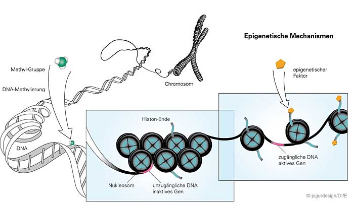 Epigenetische Faktoren verändern Histon-Enden indem sie z. B. Methyl- oder Acetylgruppen auf Lysin-Seitenketten übertragen. Dies kann die Aktivierung eines Gens erschweren bzw. erleichtern. Die direkte Methylierung der DNA verändert dann dauerhaft die Genexpression, wenn sie in Steuerbereichen von Genen erfolgt (sogenannten CpG-Inseln), die durch die Modifikation der Histone zugänglich gemacht wurden.