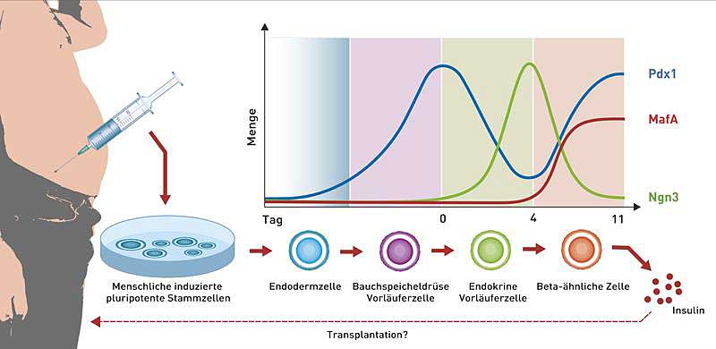 Bildunterschrift: Die Reifung von induzierten pluripotenten Stammzellen in Beta-ähnliche Zellen hängt wesentlich vom Verlauf der drei Wachstumsfaktoren Pdx1, MafA und Ngn3 ab.
