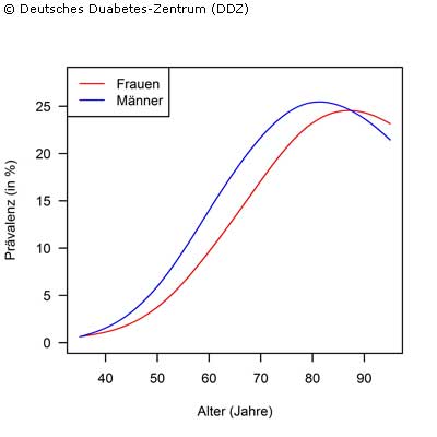 Es zeigte sich, dass die Prävalenz des Typ-2-Diabetes etwa ab dem 50. Lebensjahr in beiden Untersuchungsjahren sprunghaft anstieg und bei den GKV-Versicherten im Alter von etwa 80 Jahren ihren Höhepunkt bei rund 25 Prozent in der Altersgruppe erreicht. Zwischen dem 40. und 80. Lebensjahr stieg die Prävalenz des Typ-2-Diabetes bei Männern deutlich höher als bei Frauen an. Nach dem 80. Lebensjahr bewegte sich die Prävalenz bei beiden Geschlechtern auf vergleichbarem Niveau und sank bei der Altersgruppe ab 100 Jahren.