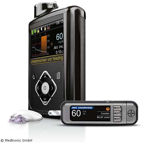 Richtig interessant wird es, wenn ein rtCGM-System mit einer Insulinpumpe gekoppelt wird. Der gemessene Gewebezucker wird automatisch an die Insulinpumpe gesendet und erlaubt dem Patienten, den Glukosewert kontinuierlich zu verfolgen.