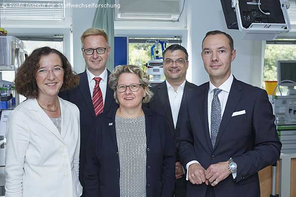 Bildunterschrift: NRW Wissenschaftsministerin Svenja Schulze (Mitte) informiert sich beim renommierten Forschungsinstitut Profil in Neuss über den aktuellen Stand der Diabetesforschung. Dr. Sabine Arnolds (Medical Liaison), Prof. Dr. Freimut Schliess (Director Science & Innovation), Svenja Schulze (NRW Wissenschaftsministerin), Dr. Carsten Benesch (Director Technical Development) und Dr. Christoph Kapitza (Chief Executive Officer) - v.l.n.r