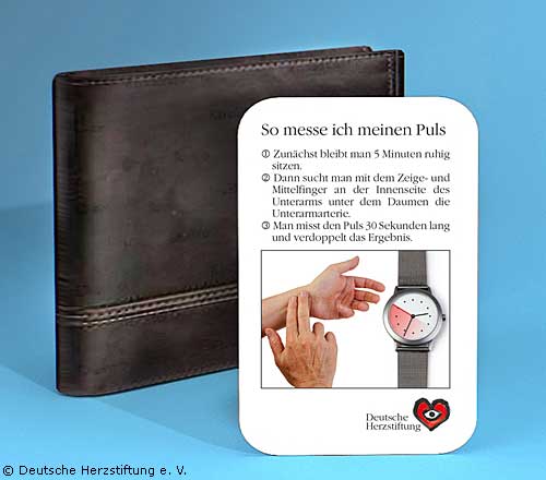 Die kostenfreie Pulskarte zur selbständigen Pulsmessung (Scheckkartengröße) kann angefordert werden bei der Deutschen Herzstiftung, Bockenheimer Landstr. 94-96, 60323 Frankfurt/Main, Tel. 069 955128-400, unter www.herzstiftung.de/puls-messen oder per E-Mail unter bestellung@herzstiftung.de