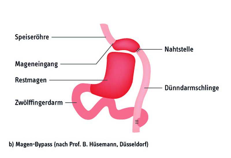 Bei der Anlage eines sogenannten Roux-en-Y-Magen-Bypasses, also einer Magenumgehung, wird der Magen-Darm-Trakt chirurgisch so umgebaut, dass die Nahrung aus einem extrem verkleinerten Magen direkt in untere Darmregionen gelangt. Der größte Teil des Magens sowie der Dünndarm werden ausgelassen. Der Körper nimmt auf diese Weise nur wesentlich weniger Kalorien aus der Nahrung auf. Allerdings ist auch die Resorption von Vitaminen und Mineralstoffen reduziert.