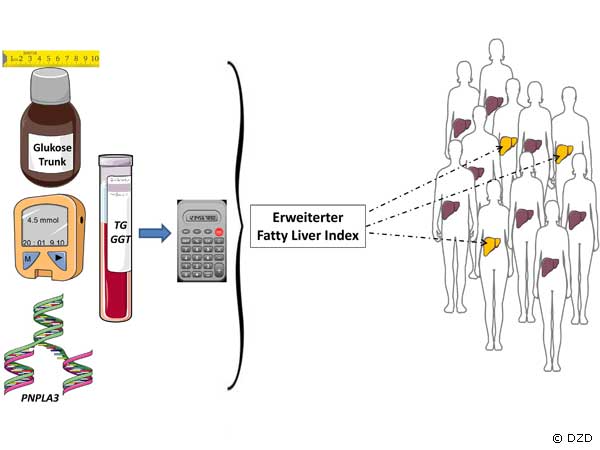 Die nichtalkoholische Fettlebererkrankung (NAFLD) hat sich zu einer globalen Epidemie ausgeweitet. Es besteht weltweit nicht nur ein großes Interesse die Ursachen und Folgen der Fettleberkrankung zu verstehen, sondern auch die Diagnose Fettlebererkrankung frühzeitig zu stellen. Forscher des Deutschen Zentrum für Diabetesforschung (DZD) haben aus klinischen Daten einen neuen Index generiert, der mit hoher Genauigkeit das Vorliegen einer Fettlebererkrankung vorhersagen kann.Etwa jeder dritte Erwachsene in den industrialisierten Ländern hat eine krankhaft verfettete Leber. Damit erhöht sich für diese Menschen nicht nur das Risiko an fortgeschrittenen Lebererkrankungen wie Leberzirrhose und Leberkrebs, sondern vor auch allem an Typ-2-Diabetes und Herz-Kreislauferkrankungen zu erkranken. Um frühzeitig mit präventiven und therapeutischen Maßnahmen intervenieren zu können, muss die Fettleber rechtzeitig erkannt werden. Hierfür sind die Ultraschalluntersuchung der Leber und die Bestimmung der Leberwerte zwar geeignet, sie können die Fettleber aber meist nur in einem fortgeschrittenen Stadium diagnostizieren. Aufwändigere Untersuchungen wie die Kernspinspektroskopie sind hierfür zwar aussagekräftiger, sie sind aber wegen der relativ hohen Kosten im klinischen Alltag nicht auf breiter Ebene einsatzfähig. Daher arbeiten Wissenschaftler weltweit an einfachen und genauen Methoden, die für die Diagnose einer Fettleber besser geeignet sind. Unter verschiedenen Indizes, die dafür entwickelt wurden, hat sich der 'Fatty Liver Index' (FLI) bestehend aus den Parametern Alter, Body-Mass-Index, Taillenumfang und den im Nüchternzustand im Blut gemessenen Werten für Triglyzeride (TG) und Gamma-Glutamyltranspeptidase (GGT), als recht effektiv erwiesen.