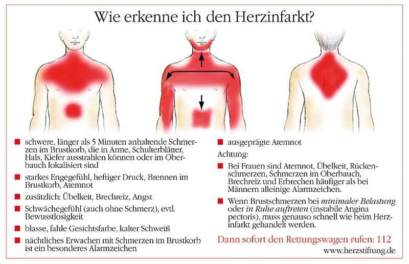 Tipps und Infos zu Herz-Kreislauf-Erkrankungen und einen Herzinfarkt-Risiko-Selbsttest erhalten Betroffene bei der Deutschen Herzstiftung unter www.herzstiftung.de oder per Tel. unter 069-955128-400. Eine Darstellung der Herzinfarkt-Alarmzeichen ist erreichbar unter www.herzstiftung.de/Anzeichen-Herzinfarkt.html.