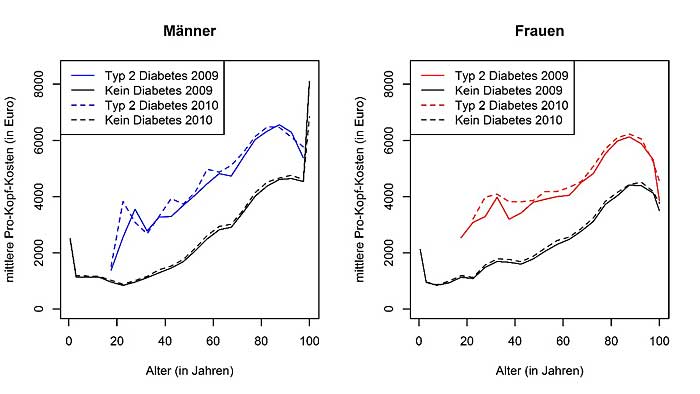 Für die Berechnungen wurde eine repräsentative Stichprobe (6,8 Prozent) aller in Deutschland gesetzlich krankenversicherten Personen herangezogen (4,3 Millionen gesetzlich Versicherte). Ausgewertet wurden die alters- und geschlechtsspezifischen Kosten pro Kopf, die bei gesetzlich Versicherten mit Typ-2-Diabetes und bei Versicherten ohne Diabetes in den Jahren 2009 und 2010 angefallen sind. Die betrachteten Kosten beinhalten die Leistungsausgaben für Ärzte, Zahnärzte, Arzneimittel, Krankenhäuser, Krankengelder und sonstige Leistungsausgaben (unter anderem Heil- und Hilfsmittel, Aufwendungen für Leistungen im Ausland, Prävention und Selbsthilfe). Ermöglicht wurde die Auswertung durch die im Jahr 2011 neu definierten Vorschriften für die Datentransparenz. In diesen ist festgelegt, dass Routineversorgungsdaten der gesetzlichen Krankenversicherung dem Deutschen Institut für Dokumentation und Information (DIMDI) übermittelt und für Versorgungsanalysen genutzt werden dürfen. Bisher wurden Krankheitskostenanalysen vorwiegend auf Basis von Routinedaten einzelner großer Krankenkassen oder Studien durchgeführt.