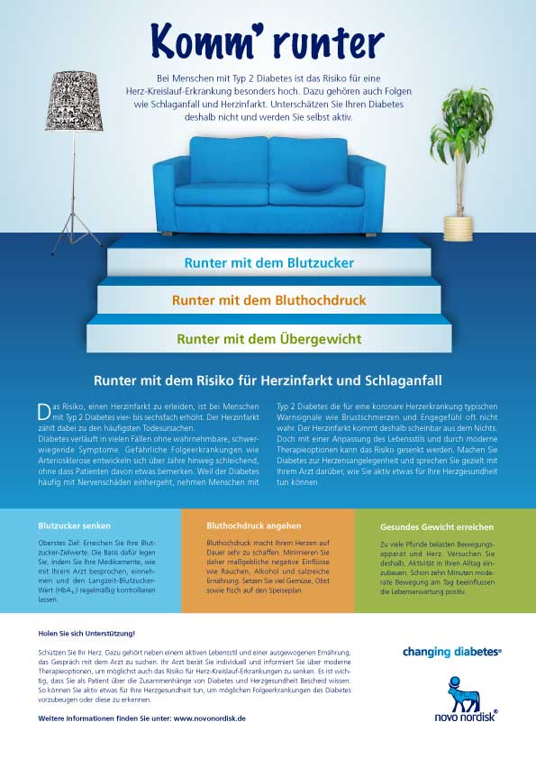 In Deutschland leiden rund 9,3 Millionen Menschen an Typ-2-Diabetes. Und sofern sie es noch nicht tun, sollten sie ihren Diabetes zur Herzensangelegenheit machen. Denn bei ihnen ist das Risiko besonders hoch, eine Herz-Kreislauf-Erkrankung zu erleiden. In dieser Personengruppe kommen Schlaganfall und Herzinfarkt viel häufiger vor als bei Menschen ohne Diabetes. Und der Herzinfarkt ist bei diesen Patienten eine der häufigsten Todesursachen. Dieses Risiko lässt sich jedoch verringern - durch einen aktiven Lebensstil, ausgewogene Ernährung und moderne Therapieoptionen. Betroffene sollten deshalb gezielt mit ihrem Arzt darüber sprechen, was sie selbst für ihre Herzgesundheit tun können. Dazu stellt die "Komm' runter"-Informationskarte von Novo Nordisk übersichtlich und leicht verständlich die wichtigsten Schritte dar.Oberstes Ziel muss es demnach sein, die Blutzuckerwerte in den Griff zu bekommen. "Die Grundlage dafür legen Patienten, indem sie die mit ihrem Arzt abgestimmte individuelle Behandlung konsequent befolgen und regelmäßig ihren Langzeit-Blutzucker kontrollieren lassen", sagt der Internist und Diabetologe Professor Dr. Werner Kern.