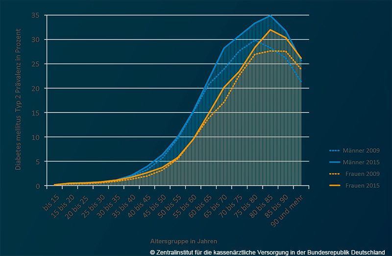 Im Jahr 2009 wurden über 6,1 Mio. gesetzlich versicherte Patienten wegen Diabetes mellitus Typ 2 behandelt. 2015 waren es bereits knapp 7 Mio. Patienten, dies entspricht einem Anstieg von etwa 14 Prozent innerhalb von sechs Jahren. Das Zentralinstitut für die kassenärztliche Versorgung (Zi) stellte anhand ärztlicher Abrechnungsdaten von gesetzlich versicherten Patienten einen Vergleich der Diagnosedaten bei Diabetes mellitus Typ 2 der Jahre 2009 und 2015 auf. In der Auswertung fehlen die privat versicherten Patienten, die etwa 10 Prozent der Gesamtbevölkerung ausmachen.Bei den jüngeren Altersgruppen zeigte sich, dass die Erkrankungsraten der Jahre 2009 und 2015 noch recht nah beieinander liegen. In der Altersgruppe der 20-25jährigen ist die Erkrankungshäufigkeit für Diabetes nahezu unverändert und liegt bei lediglich 0,5 Prozent. Bei den 35-40jährigen sind es etwas weniger als 2 Prozent der Bevölkerung, wobei Männer bei etwa 2 Prozent liegen und Frauen bei 1,5 Prozent.