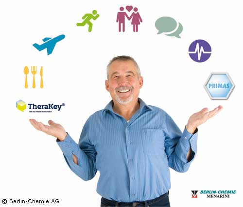 Als gute Ergänzung zu PRIMAS eignet sich TheraKey® Diabetes. Das Kommunikationskonzept der BERLIN-CHEMIE AG hilft Diabetologen bei der Patientenaufklärung und bietet Patienten außerhalb der Praxis aktuelle Informationen rund um die Erkrankung. "TheraKey Diabetes ersetzt keine Schulung, aber er kann das erlernte Verhalten stabilisieren und den Nutzer darin unterstützen, seine Motivation langfristig beizubehalten. Das Portal hat sich als wertvoller Online-Support für zuhause erwiesen", berichtet der Experte über seine Erfahrung.