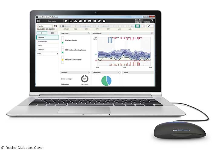 CGM-Systeme (Continuous Glucose Monitoring), die laufend den Glukosegehalt im Gewebe messen, liefern täglich große Datenmengen. Accu-Chek Smart Pix Software 3.0 bietet Ärzten eine zuverlässige digitale Lösung für die Auswertung dieser Datenflut und einen einfachen Überblick über die wichtigsten Berichte. Die Daten werden - unabhängig davon, welches System der Patient nutzt - schnell und automatisch übertragen. Die automatische Muster- und Mahlzeitenerkennung ermöglicht effizientere Therapieentscheidungen und die gezielte Anpassung der Diabetestherapie.