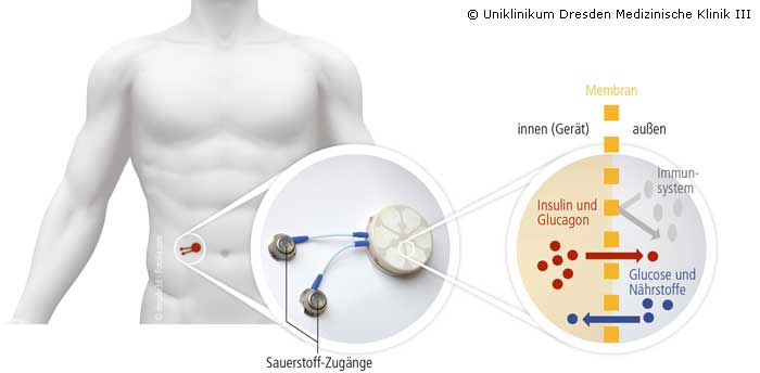 Diabetes mellitus Typ 1 ist eine Autoimmunerkrankung, die zur irreversiblen Zerstörung von insulinproduzierenden Betazellen, auch Inselzellen genannt, führt. In den letzten Jahrzehnten wurden erhebliche Fortschritte bei Betazellersatztherapien erzielt. Der Mangel an geeigneten Spenderorganen und die Notwendigkeit einer dauerhaften Unterdrückung des Immunsystems, um eine Abstoßung zu verhindern, schränken jedoch eine weiter verbreitete Anwendung dieser Strategien kritisch ein. In einer aktuellen Publikation im Fachblatt "Proceedings of the National Academy of Sciences of the United States of America" (PNAS) präsentiert eine internationale Forschergruppe aus Diabetes-Spezialisten und Chirurgen um die Dresdner Wissenschaftler Privat-Dozentin Dr. Barbara Ludwig, Dr. Stefan Ludwig und Prof. Stefan R. Bornstein vom Universitätsklinikum Carl Gustav Carus eine experimentelle Studie mit einer künstlichen Bauchspeicheldrüse.Dieser Bio-Reaktor, entwickelt mit der israelischen Firma "Beta-O2 Technologies Ltd.", erlaubt die Transplantation von artfremden, also xenogenen Inselzellen, ohne das Immunsystem zu beeinflussen. Die Forscher konnten in Kooperation mit dem Deutschen Primatenzentrum in Göttingen bei nicht-menschlichen Primaten eine stabile Transplantatfunktion und eine ausreichende Glukose-regulierte Insulinsekretion ohne die Notwendigkeit einer immunsuppressiven Medikation nachweisen. Diese Strategie eröffnet neue Möglichkeiten für eine breitere und sichere Anwendung verschiedener zellbasierter Therapien.