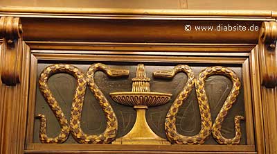 Bildunterschrift: Äsculapnattern an Schale der Hygieia in alter Apotheke.