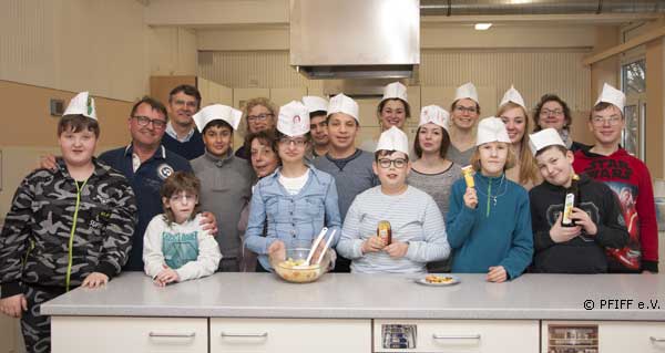 Bildunterschrift: Kinder und Lehrer der Mosaikschule mit den angehenden Diätassistenten der Schule für Diätassistenz der Kaiserswerther Diakonie und SMS-Projektkoordinator Guido Schenuit