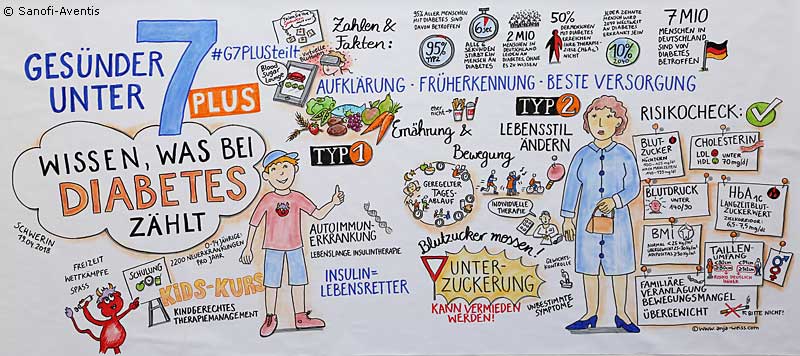 Mehr als 20 Diabetes-Experten, 21 Stunden Beratung, 800 ausgefüllte Diabetes-Risikocheckbögen mit Cholesterin- und HbA1c-Wertmessungen für Menschen mit Diabetes sowie eine #G7PLUSteilt-Wand voller Gedanken und Tipps zum Thema Diabetes - all das ist das Ergebnis der Jahresauftaktaktion von "Wissen was bei Diabetes zählt: Gesünder unter 7 PLUS". Die von Sanofi initiierte Diabetesaktion war am 19. und 20. April 2018 zu Gast im Schlosspark-Center Schwerin und startete dabei in ihr nunmehr 14. Jahr. Bildlich festgehalten wurden die Inhalte der Vorträge und Interviews zum Thema Diabetes von einer Live-Zeichnerin. Erstmalig konnten Besucher der Diabetesaktion dank Virtual Reality Brillen erleben, wie die Stoffwechselerkrankung im Körper wirkt."Das ungebrochene Interesse sowie die vielen Patienten, die durch die Diabetes-Risikochecks entdeckt wurden, zeigen, wie wichtig die Aktion 'Wissen was bei Diabetes zählt: Gesünder unter 7 PLUS' ist. Aktuell leben sieben Millionen Menschen mit Diabetes in Deutschland und die Zahl steigt. Gerade deshalb ist das Engagement der Diabetesaktion von großer Bedeutung und muss weitergehen!", so Dr. med. Richard Daikeler, Sinsheim.[*]