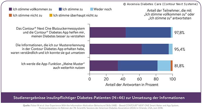 - Fisher W et al. User Experience With the Information-Motivation-Behavioral Skills (IMB)-Based CONTOUR® NEXT ONE Smart Meter and App System. Posterpräsentation im Rahmen der 78. Scientific Sessions der American Diabetes Association (ADA) in Orlando, USA, Juni 2018