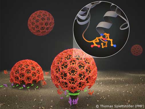 Bildunterschrift: Signalrezeptor enthaltende Vesikel (rot) werden an der Innenseite der Zellmembran (braun) gebildet und abgeschnürt. Die Lupe zeigt molekulare Details der aktiven Lipidkinase PI3KC2A, welche Signallipide herstellt. Sie sind für diesen Prozess und die nachfolgende Signalweiterleitung notwendig.