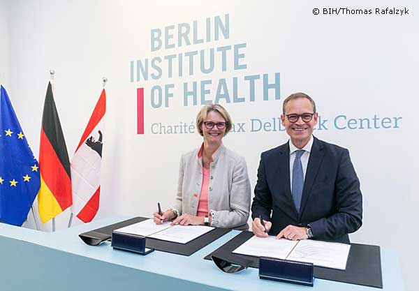 Am Mittwoch, den 10. Juli 2019, haben Bundesforschungsministerin Anja Karliczek und der Regierende Bürgermeister von Berlin Michael Müller die Verwaltungsvereinbarung zwischen Bund und Land Berlin unterzeichnet, die die Integration des Berlin Institute of Health (BIH) in die Charité - Universitätsmedizin Berlin festschreibt. Das BIH wird zur dritten Säule der Charité neben Krankenversorgung und Medizinischer Fakultät. Der Bund steigt erstmals direkt in die dauerhafte Grundfinanzierung eines Universitätsklinikums ein und betritt damit wissenschaftspolitisches Neuland. Das Max-Delbrück-Centrum für Molekulare Medizin in der Helmholtz-Gemeinschaft (MDC) wird privilegierter Partner des BIH.Professor Axel Radlach Pries, Vorstandsvorsitzender (interim) des BIH und Dekan der Charité, freute sich über die Zustimmung der Länder zur Integration des BIH in die Charité. "Ich bin wie der Regierende Bürgermeister Michael Müller fest davon überzeugt, dass dies ein guter Tag für die Patientinnen und Patienten in Berlin und deutschlandweit ist", sagte Pries. "Denn unsere Mission, die Übertragung von Forschungsergebnissen aus dem Labor in die Klinik, die Translation, wird uns in Zukunft noch besser gelingen." Er betonte, dass das BIH bereits heute beachtliche Erfolge vorweisen könne: "Mit 26 berufenen Professorinnen und Professoren, 20 Gastwissenschaftlerinnen und Gastwissenschaftlern, die insgesamt bereits mehr als 1000 wissenschaftliche Artikel veröffentlicht haben, steht das BIH in der kurzen Zeit seines Bestehens glänzend da", verkündete er stolz. "Unsere BIH Chairs verantworten hochinnovative Zentren, die die Digitalisierung der Medizin, klinische Studien und die Qualität der biomedizinischen Forschung voranbringen. Die Biomedical Innovation Academy hat bereits über 100 klinisch forschende Ärztinnen und Ärzte ausgebildet und der Digital Health Accelerator des BIH hat die digitalen Gesundheitsideen von sechs Teams bis zur Markteinführung gebracht. Darüber hinaus hat das BIH Infrastrukturen wie 12 Core Facilities geschaffen, die die translationale Forschung, das Kernanliegen des BIH, unterstützen."