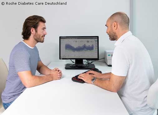 Bildunterschrift: Arzt und Patient besprechen Diabeteseinstellung anhand einer Auswertung mit der Accu-Chek Smart Pix Software.