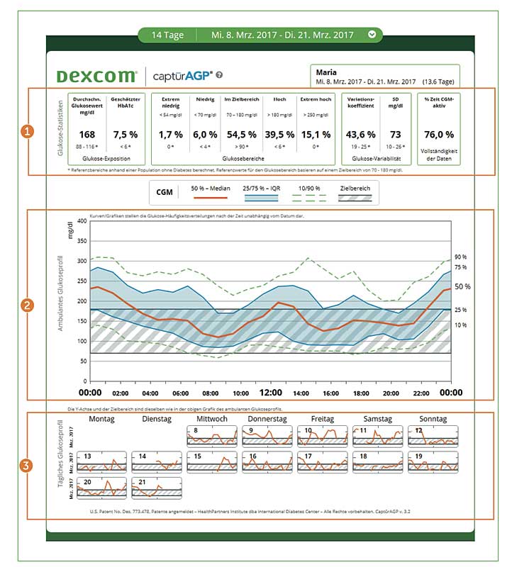 …treten nun Kurven und Perzentilen. Dargestellt werden diese zum Beispiel in Form von verschiedenen Berichten, wie Übersichten, Musterberichten, Vergleichsberichten oder AGP-Profilen, z. B. mittels der Software Dexcom CLARITY. In jedem Bericht ist neben anderen Parametern, wie der Standardabwei-chung oder dem hypoglykämischen Risiko, die TiR abgebildet. Den Grund dafür, warum eine zusätzliche Messgröße, wie die TiR, neben dem HbA1c immer mehr an Wichtigkeit gewinnt, sehen Experten vor allem in der Notwendigkeit einer Metrik für die glykämische Kontrolle, die informative therapeutische Entscheidungen ermöglicht und sich aus verwertbaren Informationen ableiten lassen. Der HbA1c gilt als Surrogatparameter für die Entwicklung von Langzeitkomplikationen und Spätfolgen aufgrund eines Typ-1- oder Typ-2-Diabetes und wurde bisher vor-rangig als primärer Endpunkt vieler CGM-Studien definiert. Allerdings gibt er keinen Aufschluss über akute glykämische Entgleisungen und Komplikationen durch Hypo- und Hyperglykämien. Darüber hinaus können physiologische Veränderungen, wie z. B. eine Anämie oder Eisenmangel den HbA1c beeinflussen und verfälschen. Damit ist seine Aussagekraft in Bezug auf die Glukosevariabilität zwar limitiert, verliert jedoch trotzdem nicht an Relevanz und sollte nach wie vor für Therapieentscheidungen berücksichtigt werden.[2]