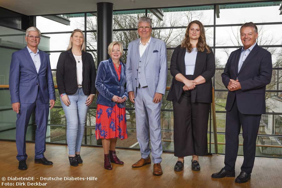 Bildunterschrift: Vorstand und Geschäftsführung von diabetesDE seit November 2024, v.r.n.l.: Dr. Michael Kleer, Tanja Braun, Nicole Mattig-Fabian, Dr. Jens Kröger, Stephanie Haack, Prof. Dr. Thomas Haak. Es fehlen Diana Droßel und Maya Curman.