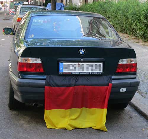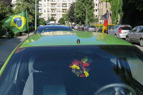 Gefühlt war jedes zweite Auto mit einer oder auch mehreren Fahnen geschmückt. Am häufigsten war die schwarz-rot-goldene Nationalflagge Deutschlands, die hier kreativ am Kofferraum hängt. Neben Schwarz-Rot-Gold war auch die Fahne des Gastgeberlandes Brasilien zu sehen.