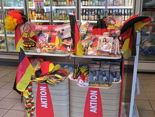 Wo die Fußballfreunde Fahnen, Ketten und anderen Schmuck für ihr Auto und sich eigentlich erwerben können, habe ich im mich immer wieder gefragt. Die Antwort fand ich in einer Tankstelle, die zudem natürlich auch das Sixpack Bier und andere Getränke anbietet.