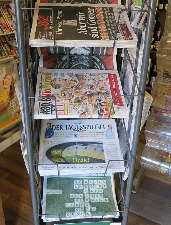 Beim Bäcker, den ich am Ende meines Laufes ansteuerte, gab es neben Weltmeisterbrötchen auch die aktuellen Tageszeitungen. Jede hatte die Weltmeisterschaft auf der Titelseite. Die „BZ“ titelte: „Ihr seid Pabst. Aber wir sind Götter“, Der Tagesspiegel bot ein Bild vom Stadion mit „Finale“ in der Überschrift und der „Berliner Kurier schreibt: „Wir sind dein 12. Mann Jogi!“.