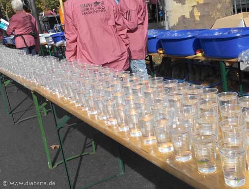 hatten Helfer hunderte Becher mit Wasser gefüllt. Auch die Johanniter bereiteten sich für Notfälle vor. „Besonders beim Stopp zum Trinken kann ein Läufer schon mal Schwierigkeiten mit dem Kreislauf bekommen“, berichteten sie. Die Stimmung war hervorragend. Überall freute man sich schon auf die Läufer. Aber jetzt musste ich mich beeilen, um den Marathon-Start nicht im Fernsehen zu verpassen. Schließlich twittern wir stets aktuell vom Berlin-Marathon.