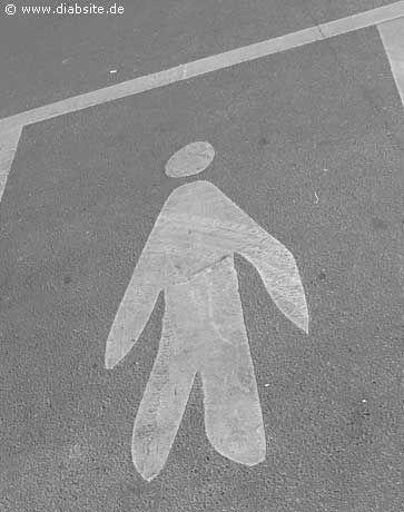 Auf dem Heimweg sah ich auf der Straße plötzlich nebenstehendes Verkehrszeichen. Es mahnt Auto- und Radfahrer, auf Fußgänger zu achten. Die Figur ist gerade dabei, ihren Kopf zu verlieren. Der Hals fehlt. Außerdem ist sie dicker, als andernorts. Hat das Straßenverkehrsamt hier vielleicht einen Menschen mit Typ-2-Diabetes gemalt?