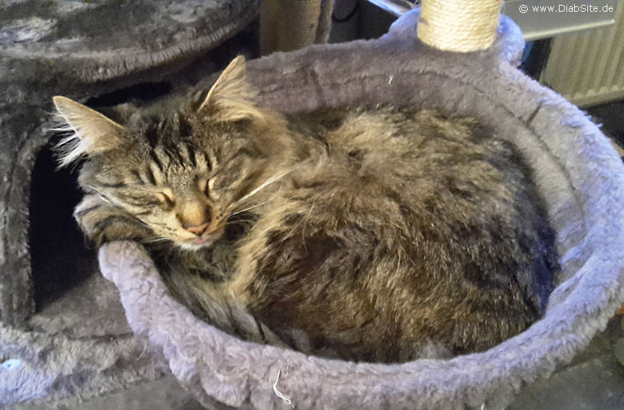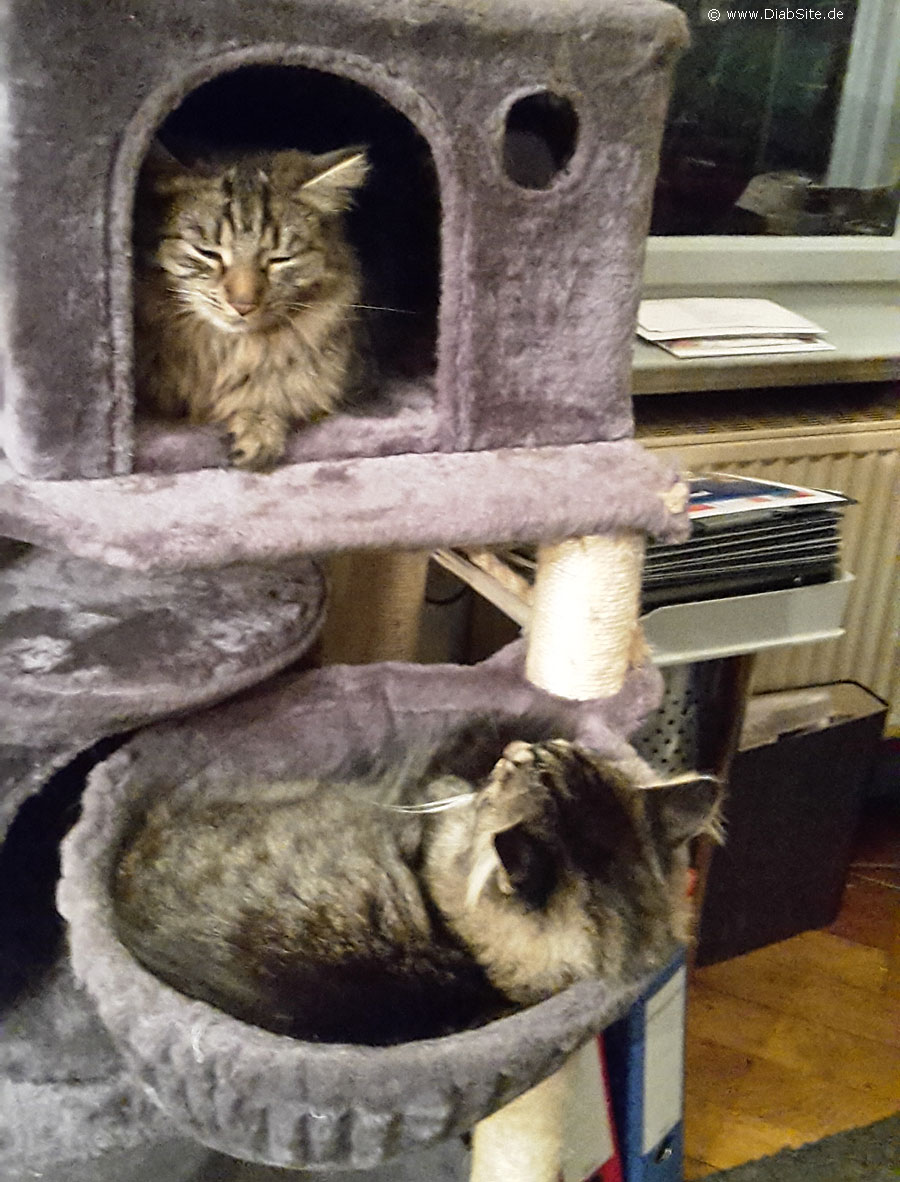 Zweimal am Tag werden unsere „Taschentiger“ gefüttert. Dabei versuchen Sie immer wieder, uns das Futter zu klauen. Nach dem Fressen rennen sie etwa fünf Minuten lang durch die Wohnung. Dann wollen sie nur noch schlafen. Hier liegen Charly (oben) und Banti (unten) satt im Kratzbaum. Auch die übrigen Mitglieder des DiabSite-Teams dürfen dann zur Ruhe kommen. Vor der nächsten Fütterung ist dann aber Spielen angesagt. Bälle werden durch die Wohnung gekickt und Stoffmäuse gefangen. Die beiden Webkater machen DiabSite-Initiatorin Helga Uphoff und Unterstützerin Birgit Ruben immer wieder Spaß. Sie sind die besten Musen der Welt.